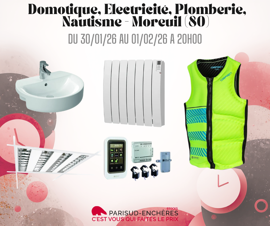 DOMOTIQUE, ELECTRICITE, PLOMBERIE – Du 30/01 au 01/02 – Moreuil (80) – EXPEDITION POSSIBLE Envoi : Livraison partout en France Métropolitaine. Tarifs : CGV LIVE MOREUIL 2026 Le lieu de vente se situe à Moreuil (80) Pour participer à la vente cliquez sur l’onglet -> PARISUD ENCHERES STOCKS, Commissaires-Priseurs | Interencheres.com