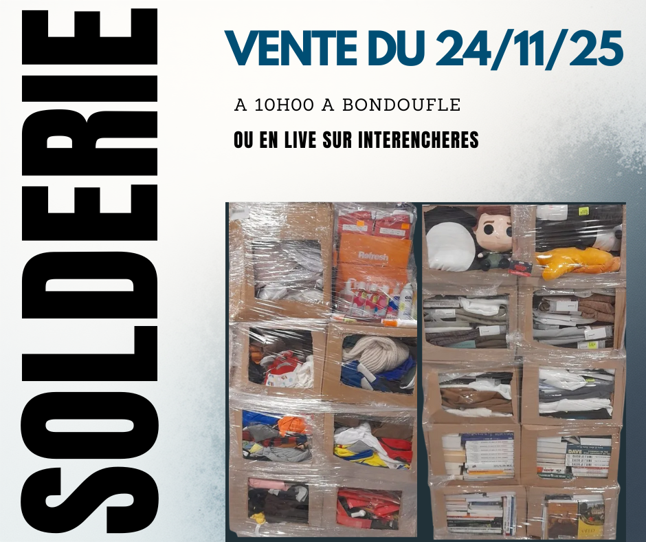 Lots de Solderie, Textiles & Chaussures, Produits d’Hygiène, Jeux et Jouets … Etc – Bondoufle (91) – le 24/11 – EXPEDITION POSSIBLE VENTE EN SALLE ET EN LIVE – PROFESSIONNELS et PARTICULIERS Le lieu de vente et de retrait se situe à Bondoufle (91) Envoi des palettes possible – Sur devis après la vente. Pour […]