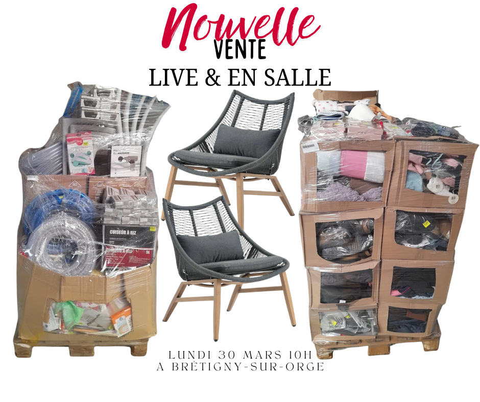 VENTE EN SALLE ET EN LIVE – PROFESSIONNELS et PARTICULIERS CONDITIONS DE VENTE : CGV LIVE BRETIGNY 2026 Le lieu de vente et de retrait se situe à Brétigny-Sur-Orge (91) Envoi des palettes possible en France métropolitaine – Sur devis après la vente. Pour participer à la vente cliquez sur l’onglet -> PARISUD ENCHERES STOCKS, […]