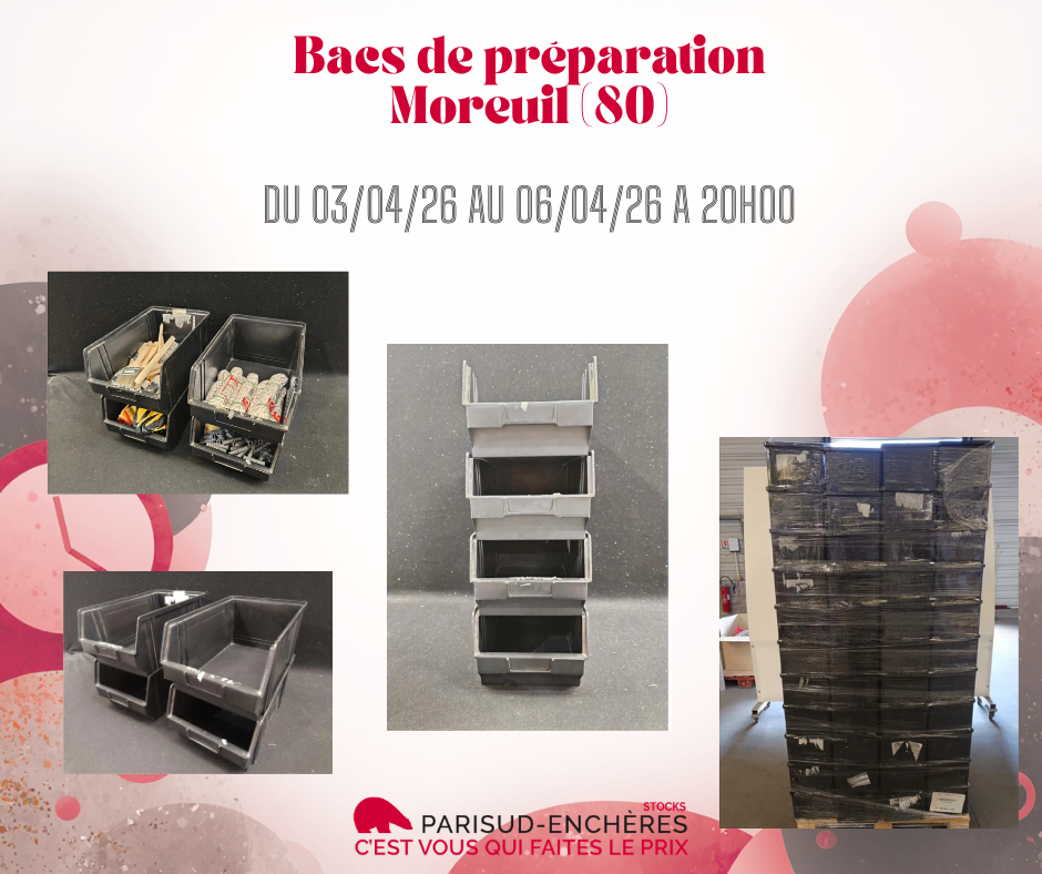 MOREUIL (80)Envoi : sur demande par mail après réception du bordereau d’adjudication. VENTE 100% EN LIVE – PROFESSIONNELS et PARTICULIERS Le lieu de vente et de retrait se situe à Moreuil (80) . Pour participer à la vente cliquez sur l’onglet -> PARISUD ENCHERES STOCKS, Commissaires-Priseurs | Interencheres.com