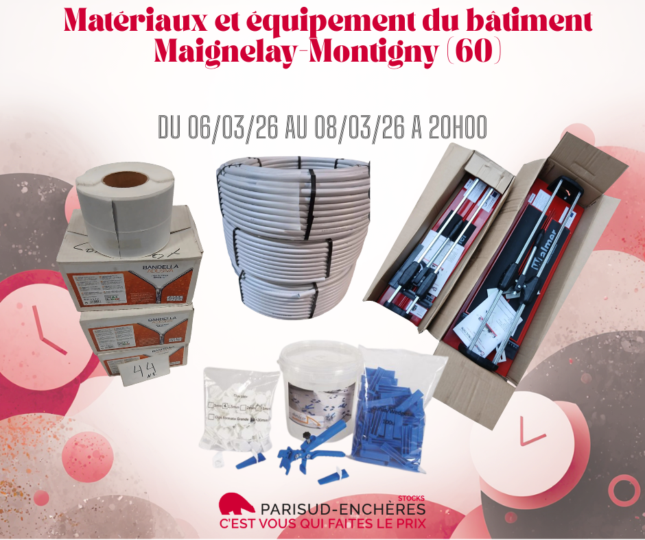 MAIGNELAY MONTIGNYMatériaux & Équipement du Bâtiment : Carrelage, Mosaïque, Profilés Aluminium, Plomberie Multicouche, Éclairage LED – Du 06/03 au 08/03 – Retrait à MAIGNELAY-MONTIGNY (60) ATTENTION RETRAIT DANS LE 60 : MAIGNELAY_MONTIGNY Pour participer à la vente cliquez sur l’onglet -> PARISUD ENCHERES STOCKS, Commissaires-Priseurs | Interencheres.com